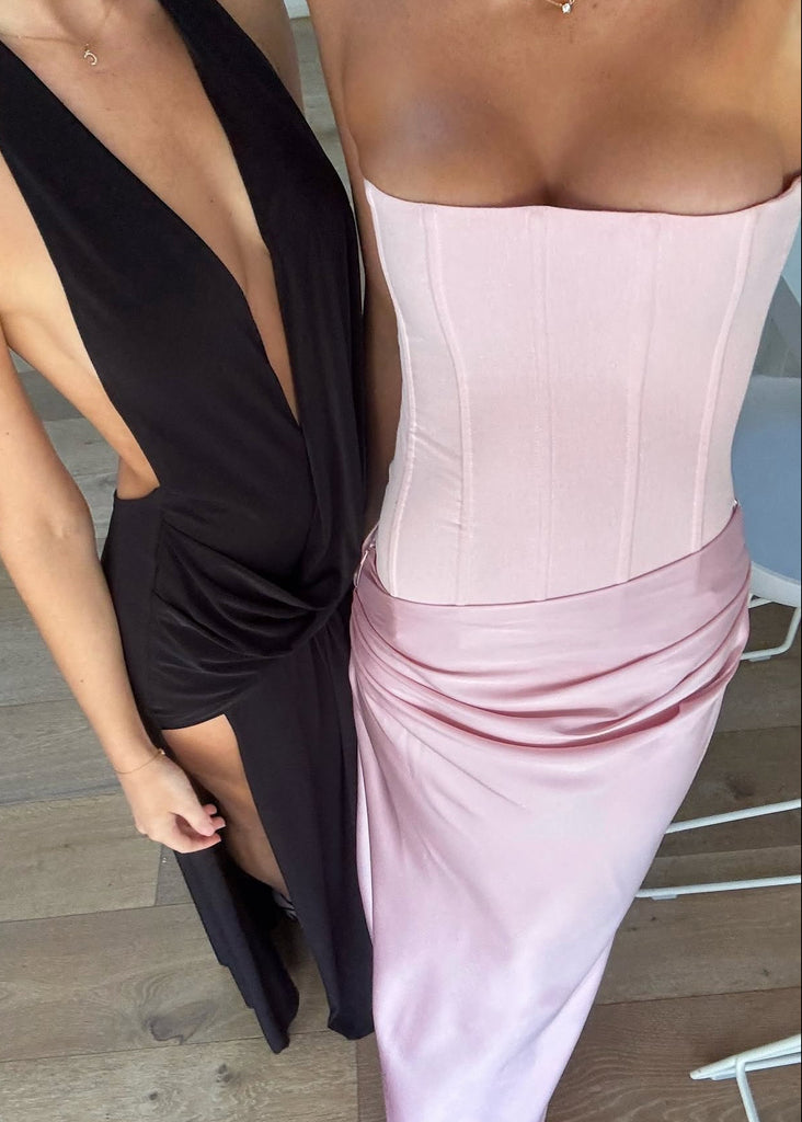 Elegant and unique, the Huxley gown blends modern trends with timeless simplicity. The flattering corset features intricate boning that sculpts the bust and waist, while the detachable draped skirt with ruched detailing adds graceful movement. A perfect balance of boldness and sophistication.