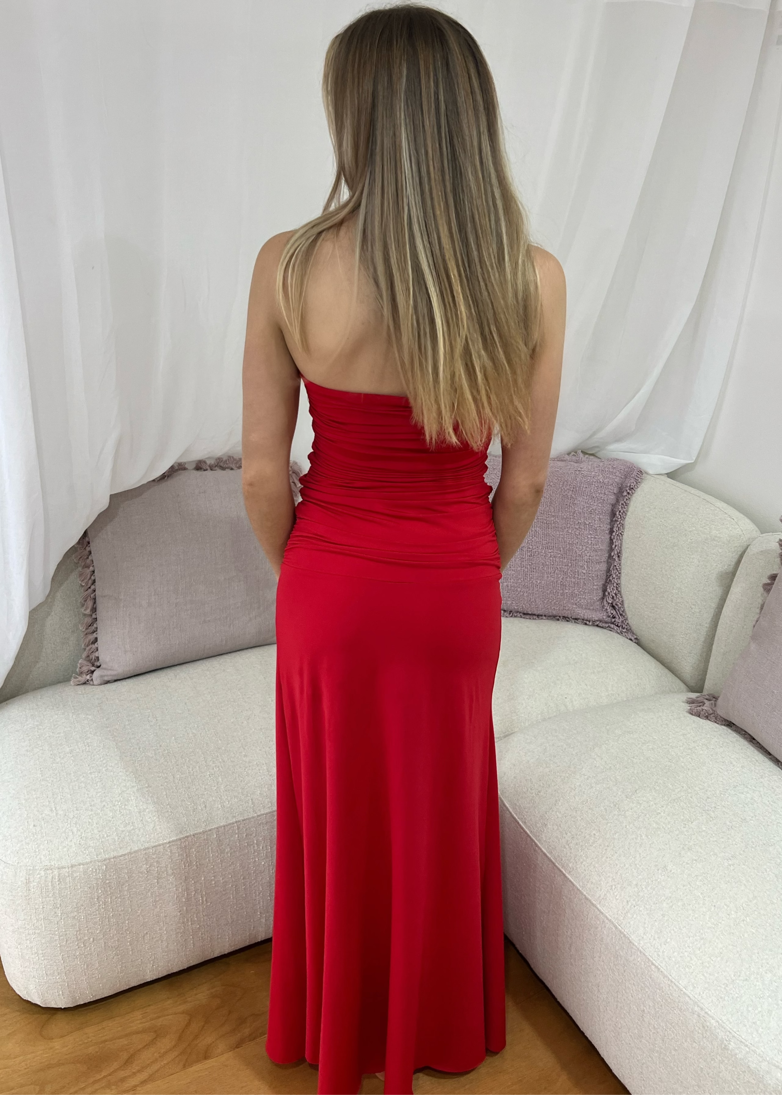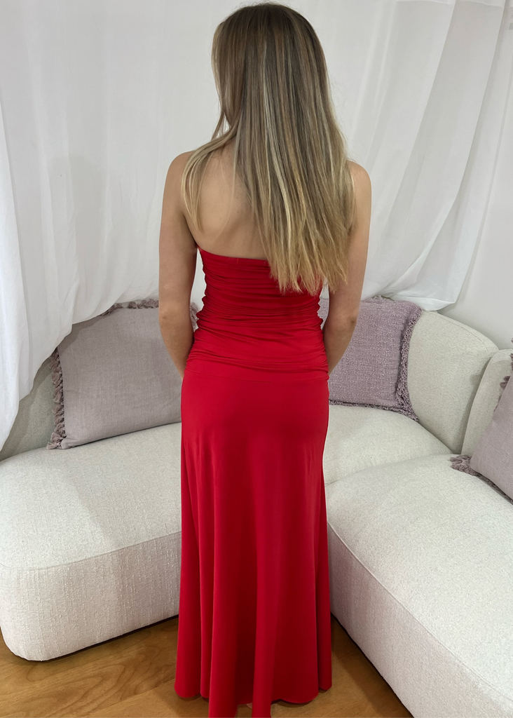 Introducing the Remi Dress, featuring elegant ruching details on both sides to comfortably enhance the body's natural curves. The dress includes a double-lined top and a single-lined skirt. This versatile dress is a perfect staple piece to elevate your wardrobe and is suitable for any event. The Remi dress features a raw-cut hem and split which add a touch of uniqueness.