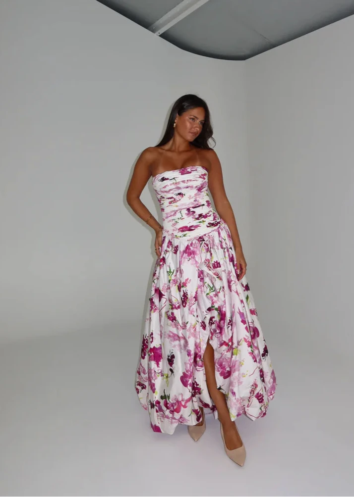 Exude dramatic elegance in the Behold Maxi Dress and rendition of the popular Violette Bubble Hem from AJE. Ruching defines the fitted bodice while an asymmetrical high-low hem balances volume and proportion. Dress up with delicate jewellery and strappy heels, or offset the drama with easy flats.