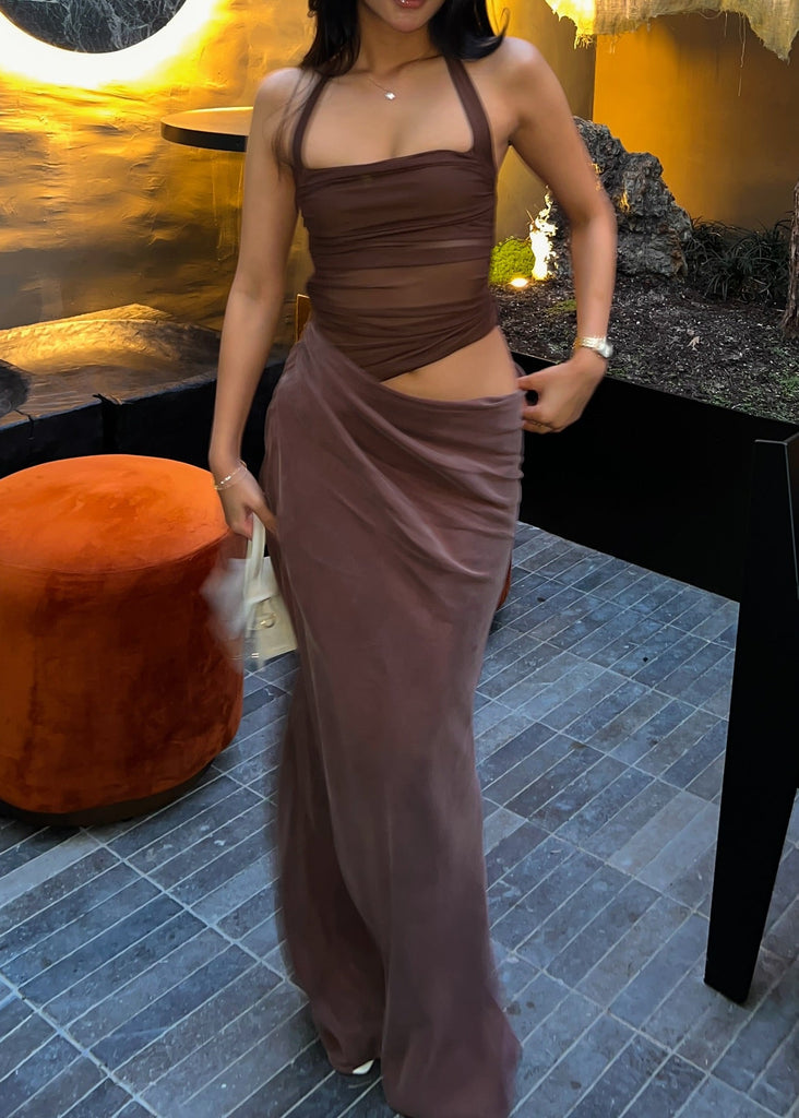 The Gina Maxi Dress is the perfect summer update of our popular Yasmin Maxi Dress. The halter mesh top adds a touch of elegance, while the gathers through the waist create a flattering silhouette. The cupro skirt features a stylish cowl on the wearers left side waist. Stay comfortable and chic all summer long.