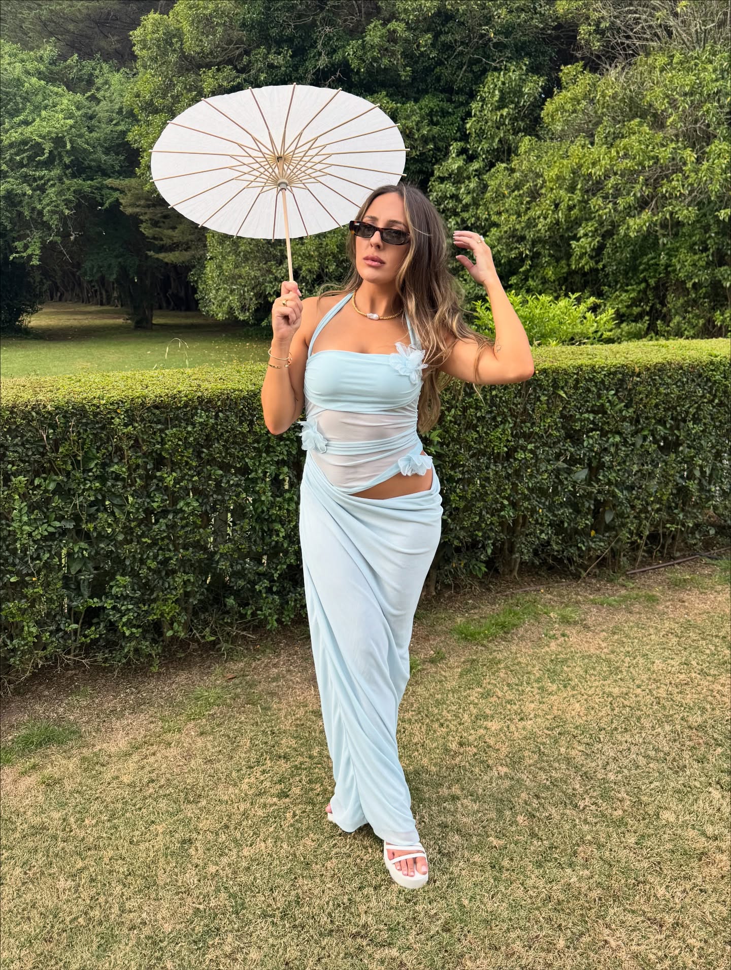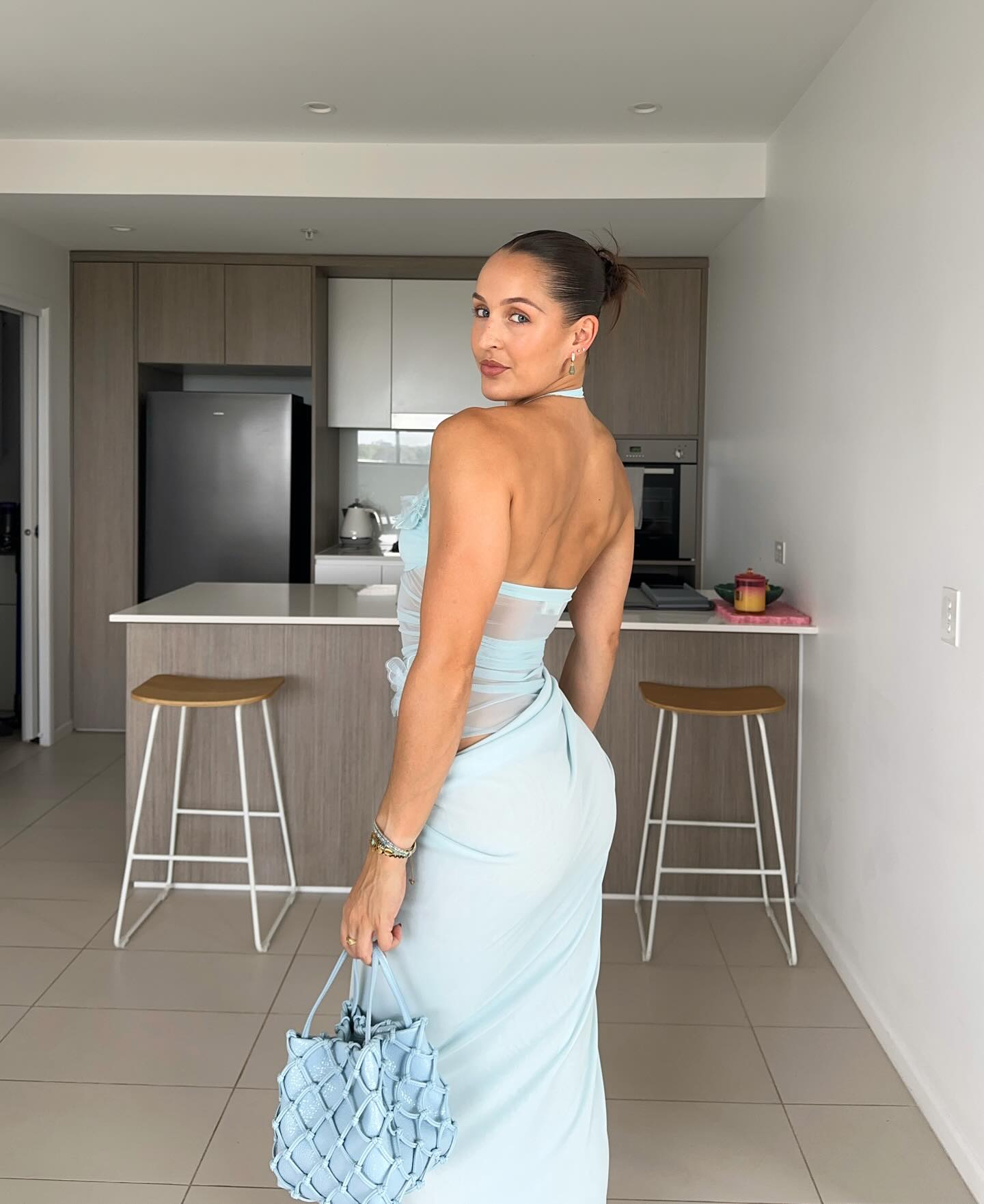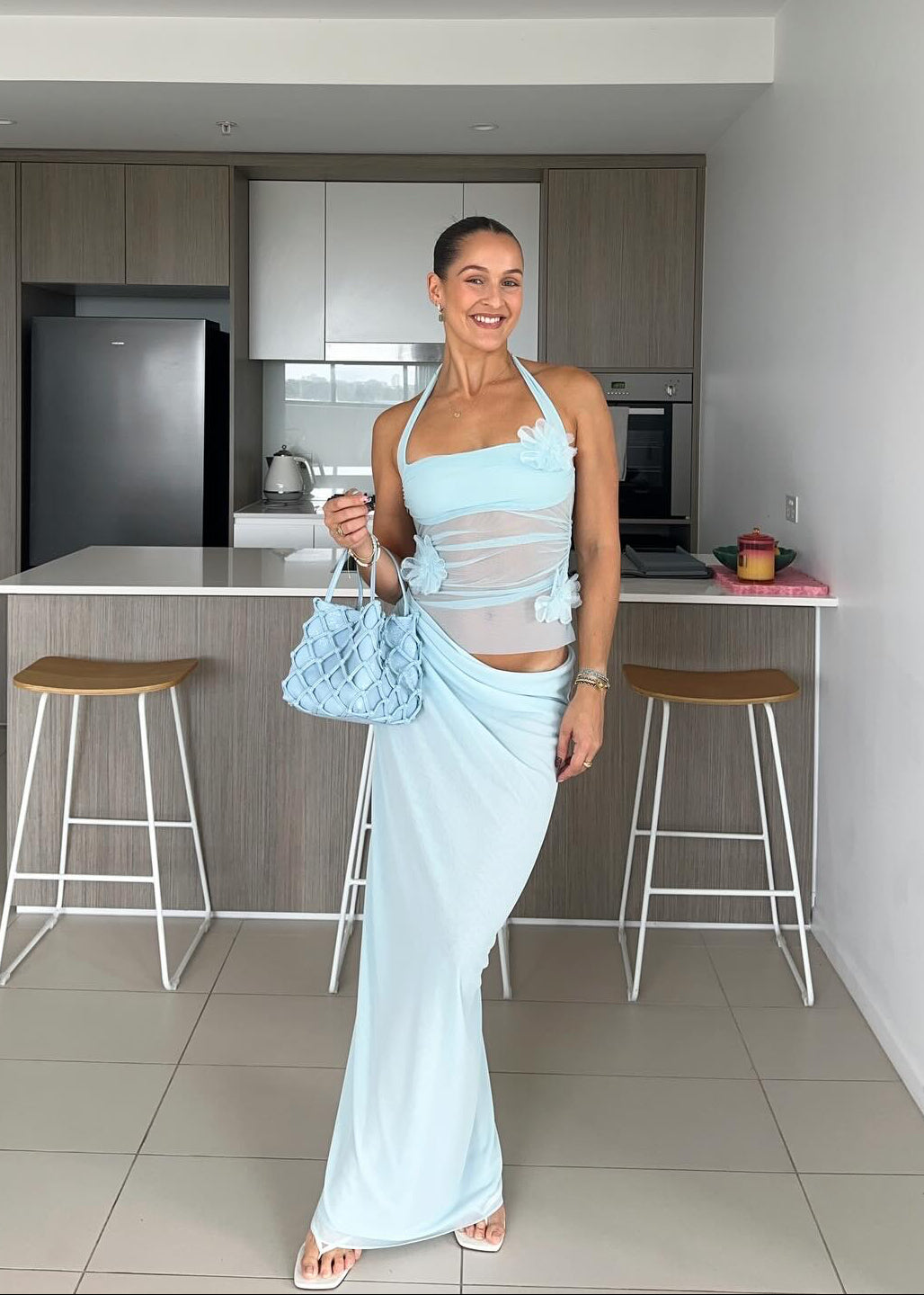 The Florence Maxi Dress showcases a halter mesh bodice with gathered detailing at the waist for a flattering fit. Statement floral decals highlight the top, while the skirt falls to a maxi length and finishes with a soft cowl drape at the wearer’s left side.