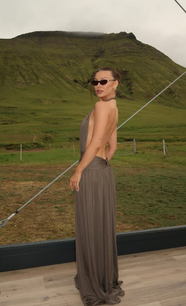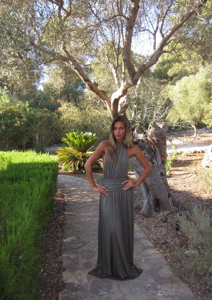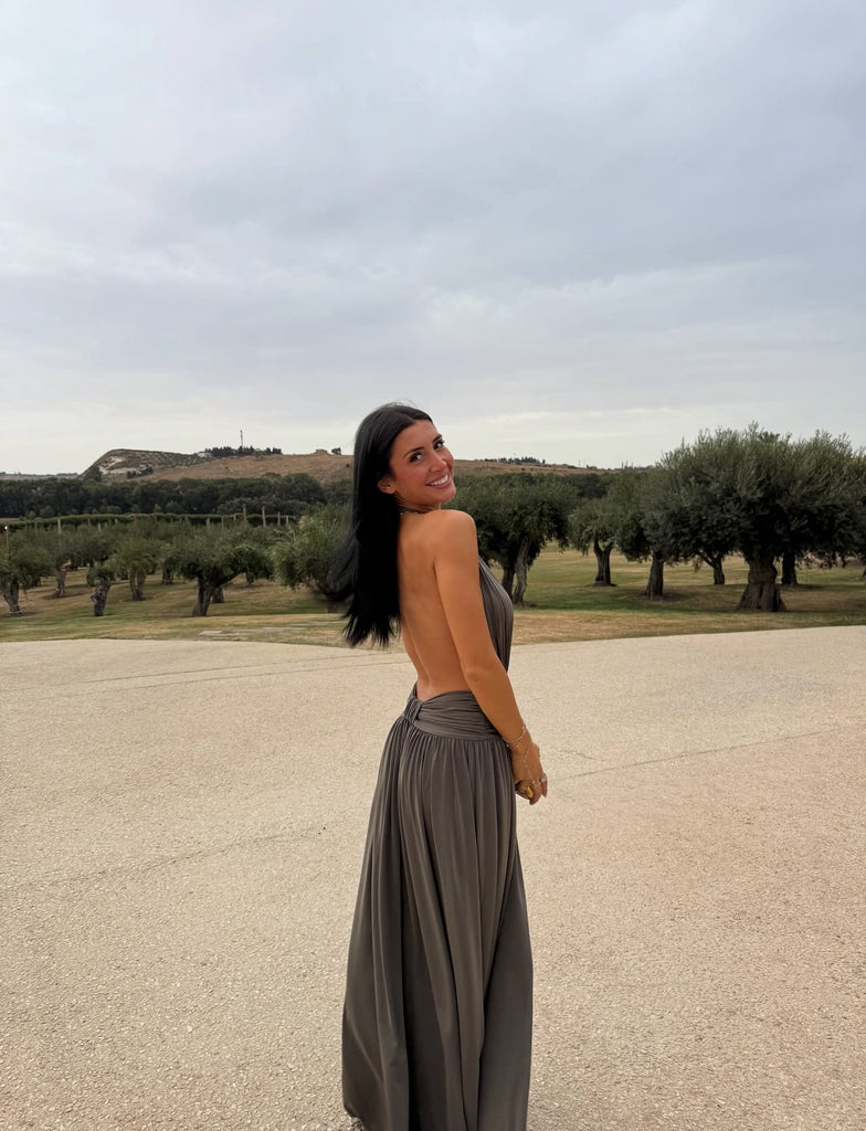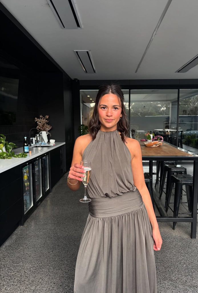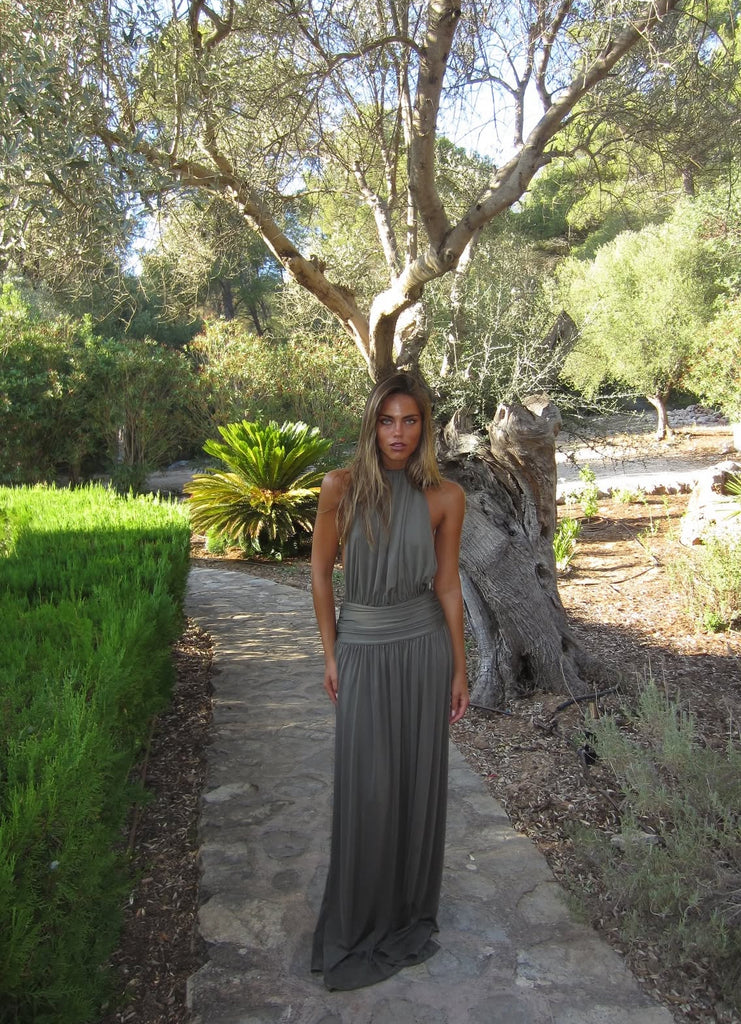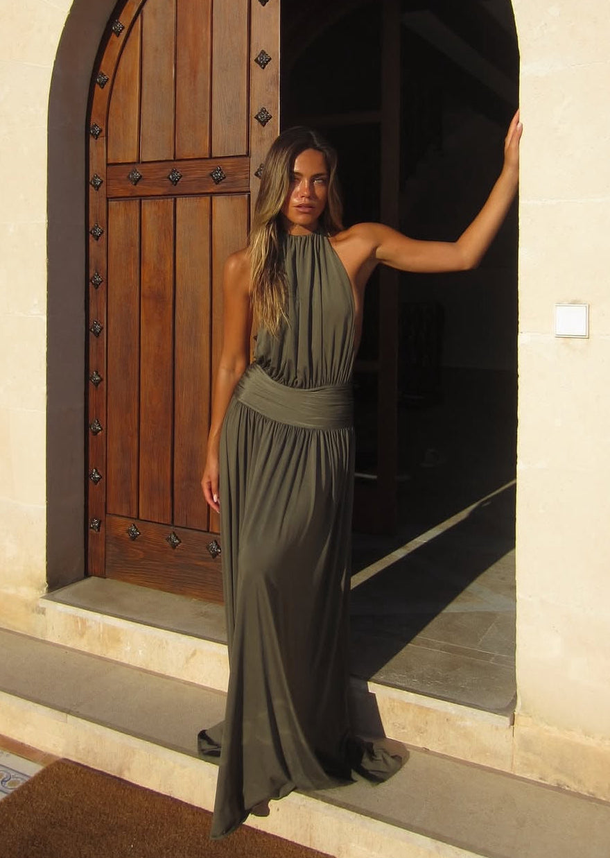 Introducing Santina, a draped silhouette crafted for ease and versatility. Made from a slinky khaki drape, she features a timeless halter neckline and a low-set waistband to anchor. The dress softly drapes over the body with gentle gathers, finishing effortlessly floor-length. Complete with a sensual open back and a ruched centre detail, Santina is made for warm nights and confident moments.