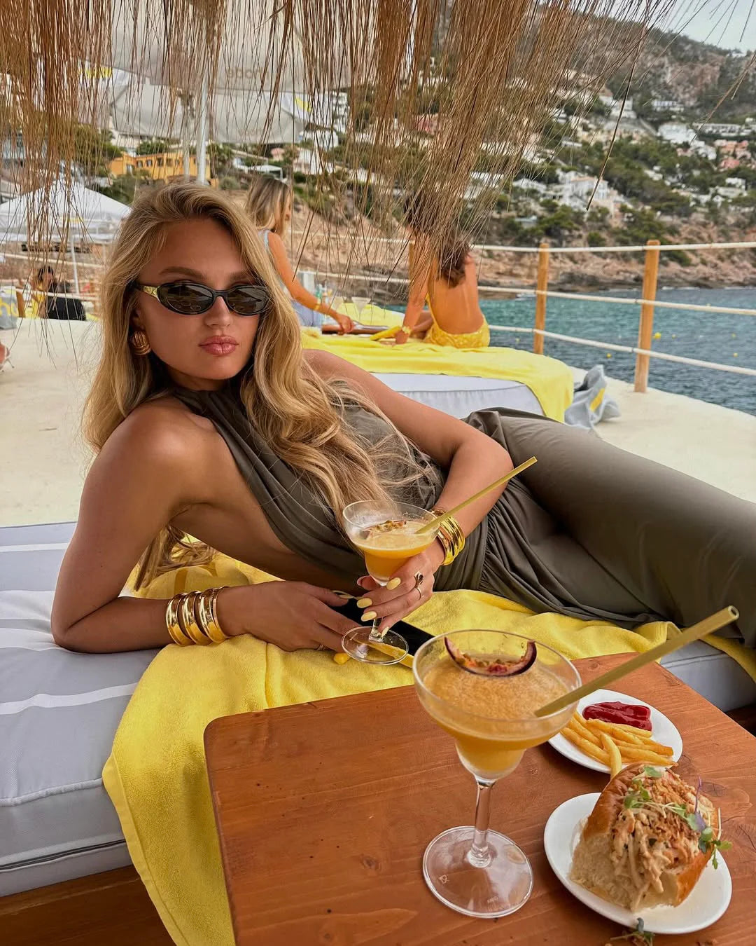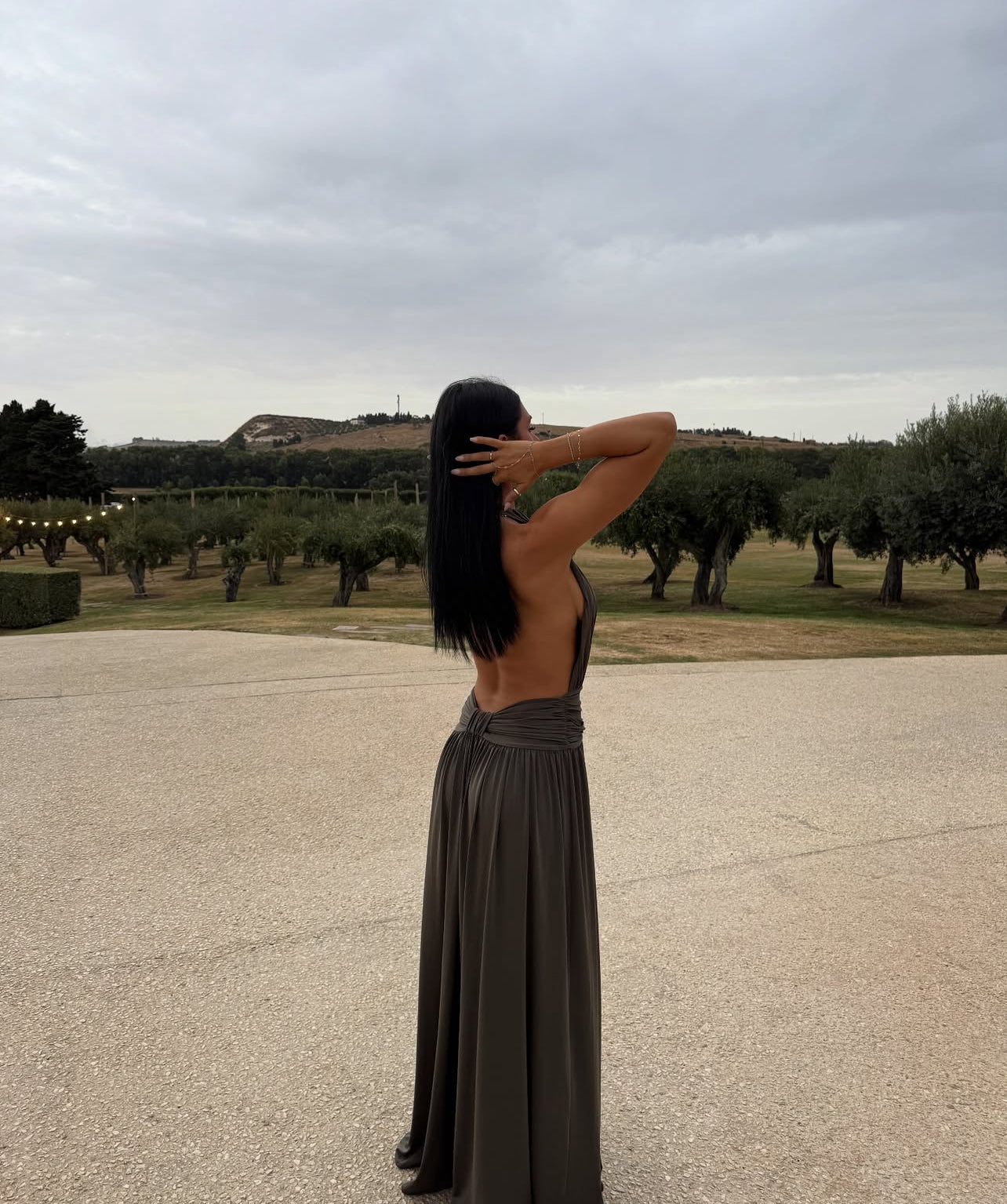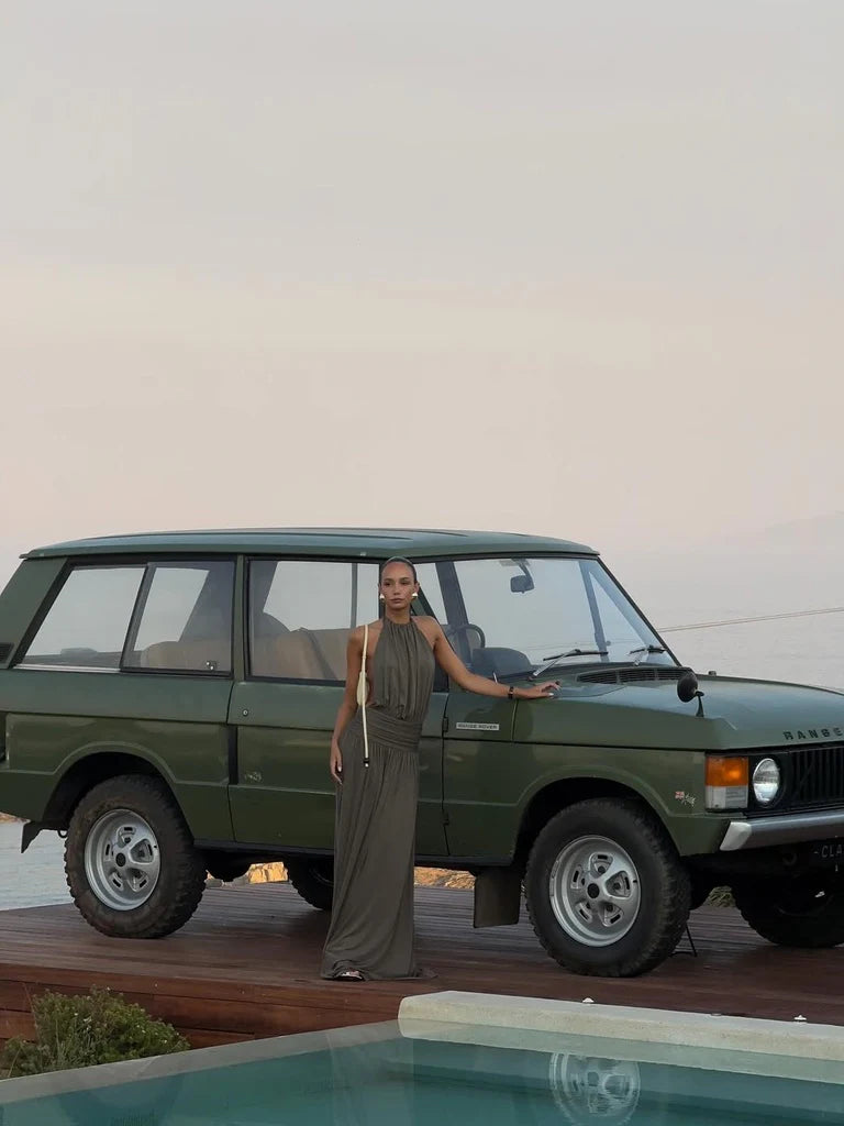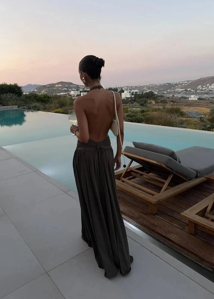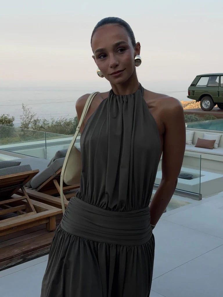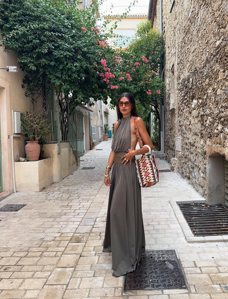 Introducing Santina, a draped silhouette crafted for ease and versatility. Made from a slinky khaki drape, she features a timeless halter neckline and a low-set waistband to anchor. The dress softly drapes over the body with gentle gathers, finishing effortlessly floor-length. Complete with a sensual open back and a ruched centre detail, Santina is made for warm nights and confident moments.