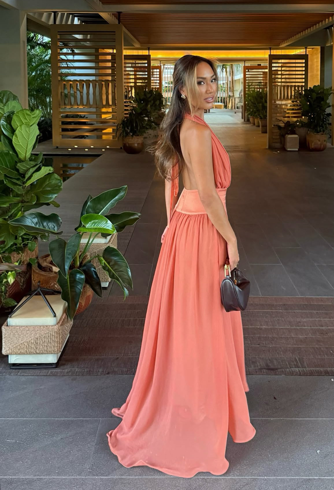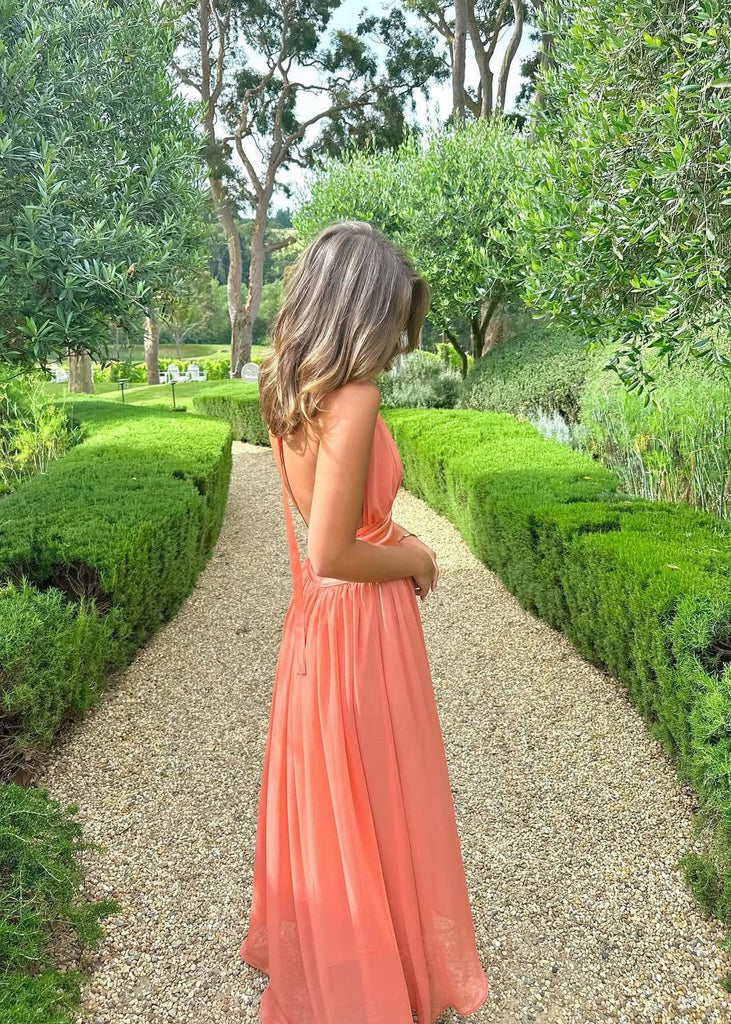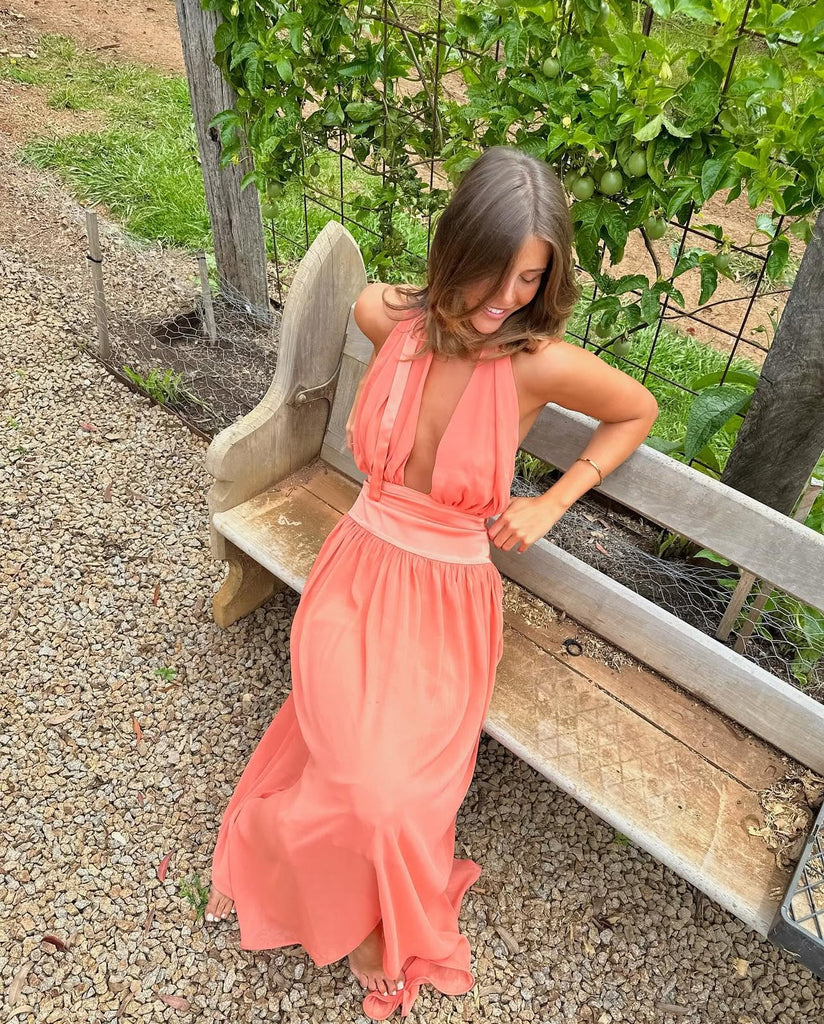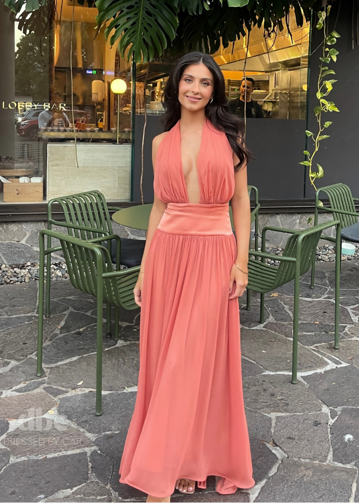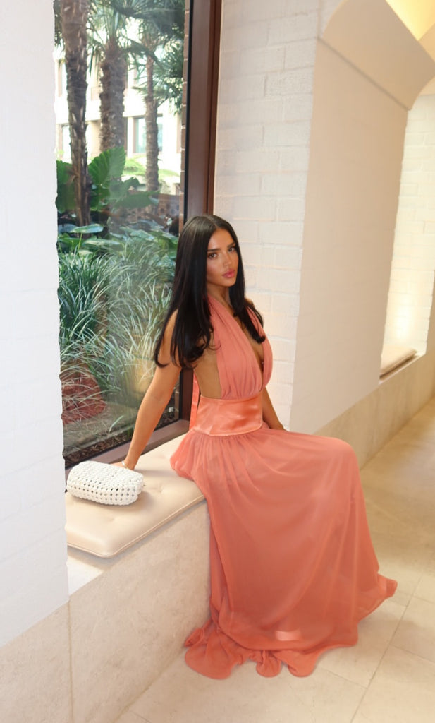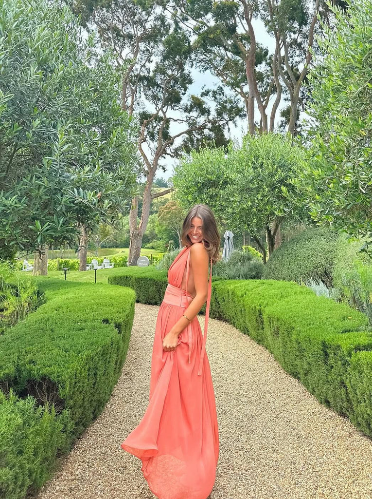 Introducing Serena, a striking fusion of femininity and elegance. Designed in a lustrous Coral hue, she radiates a warm and earthy charm. Serena features a flattering drop-waistband crafted from a quality viscose. Her graceful georgette drape cascades over the bust and flows from the hips. Fasten her sensual halter neckline securely around your neck, and let the ties gracefully trail down the open back. Lined to complete, Serena is the perfect selection for your sunlit seasonal sips.