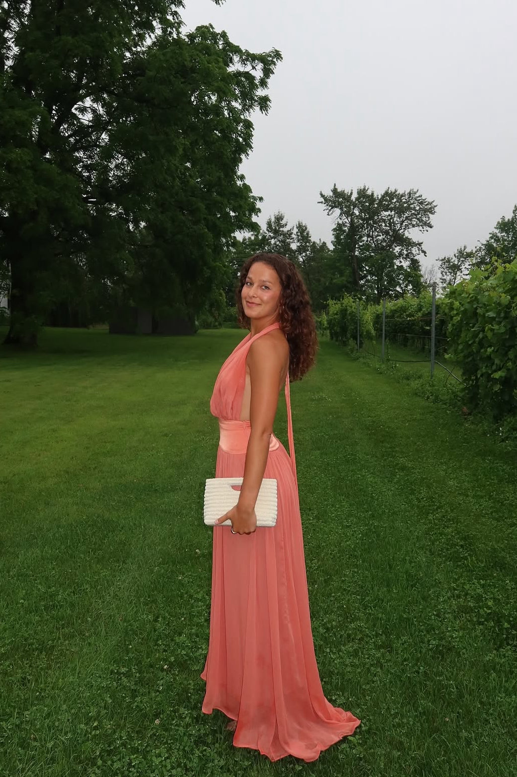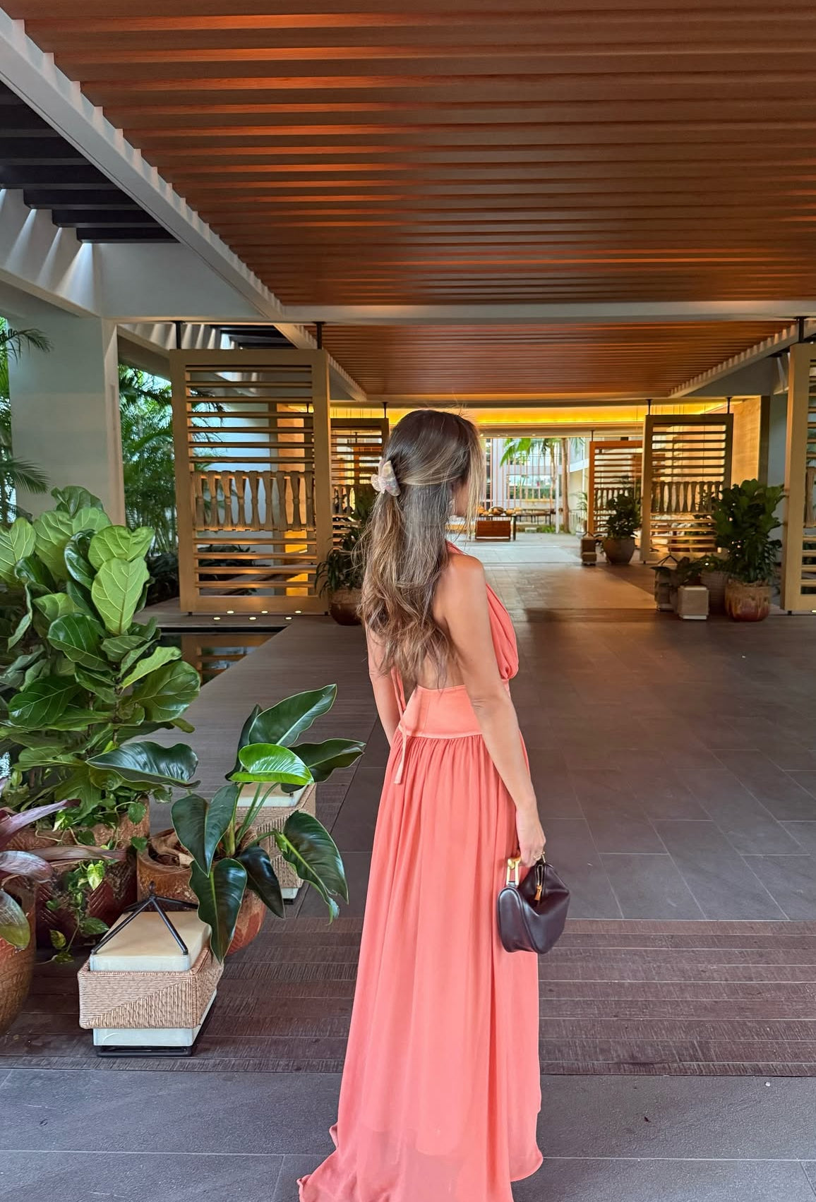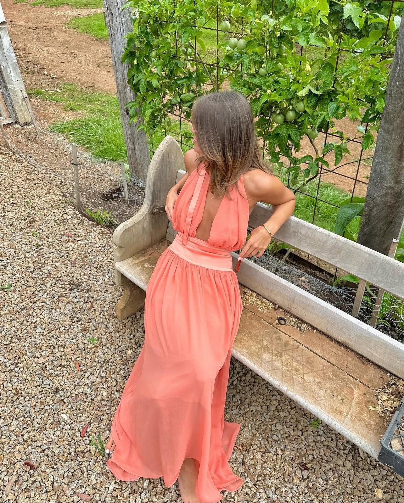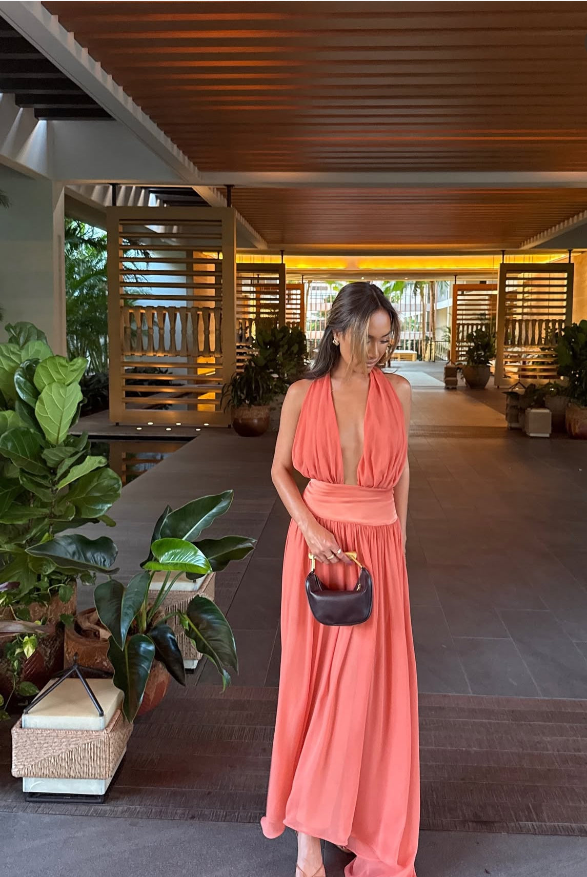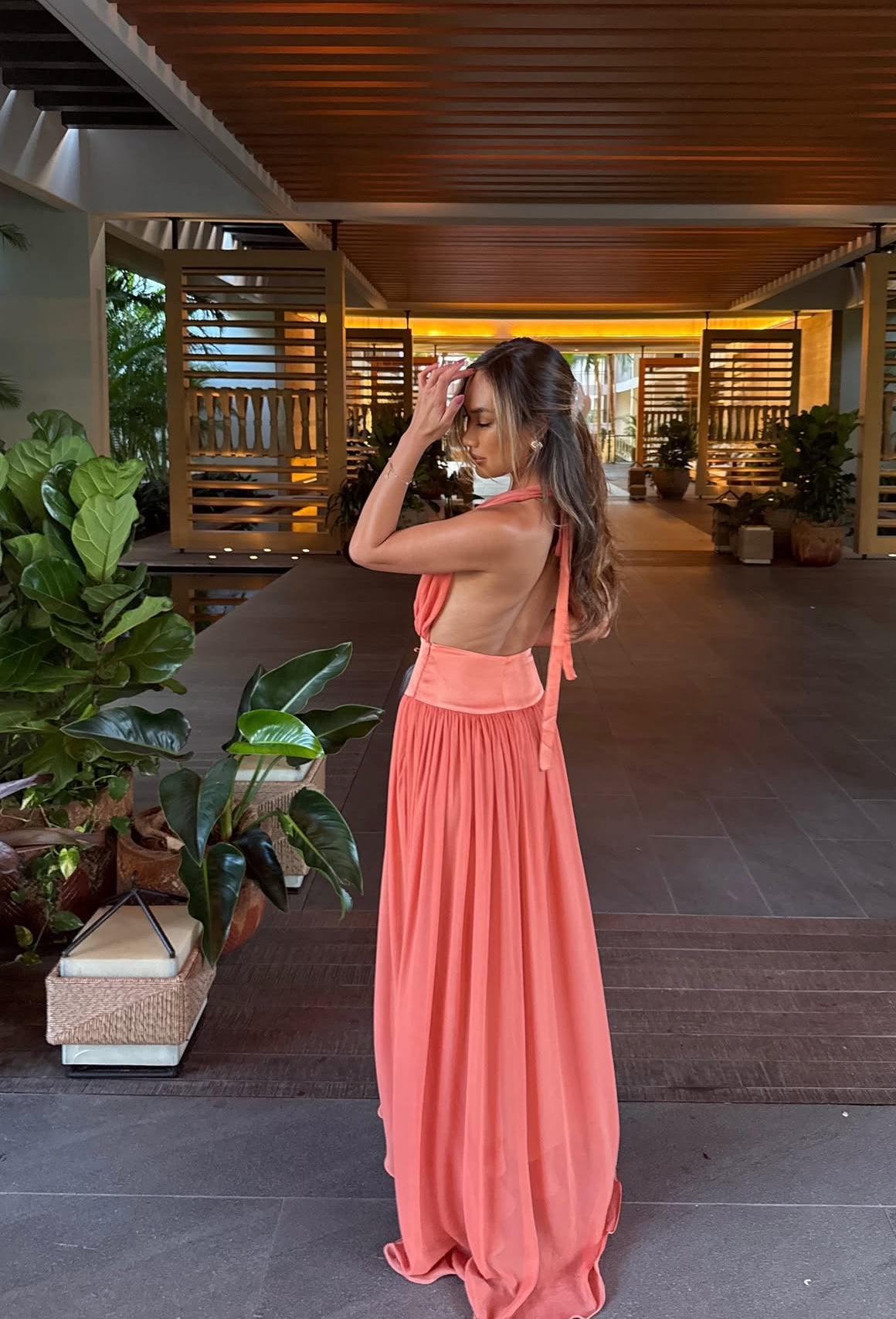 Introducing Serena, a striking fusion of femininity and elegance. Designed in a lustrous Coral hue, she radiates a warm and earthy charm. Serena features a flattering drop-waistband crafted from a quality viscose. Her graceful georgette drape cascades over the bust and flows from the hips. Fasten her sensual halter neckline securely around your neck, and let the ties gracefully trail down the open back. Lined to complete, Serena is the perfect selection for your sunlit seasonal sips.